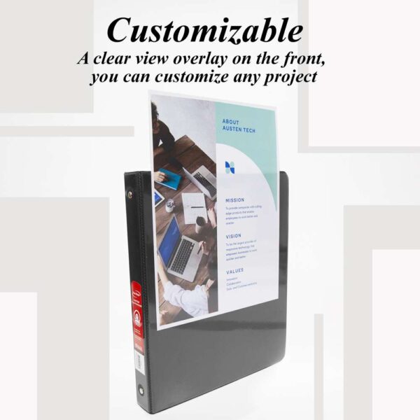 - GREAT DURABILITY. Designed and manufactured with enhanced durability featuring a tear-resistant cover with clear transparent view covers to insert or customize your binder on the front, back and spine. Two interior pockets for extra storage.