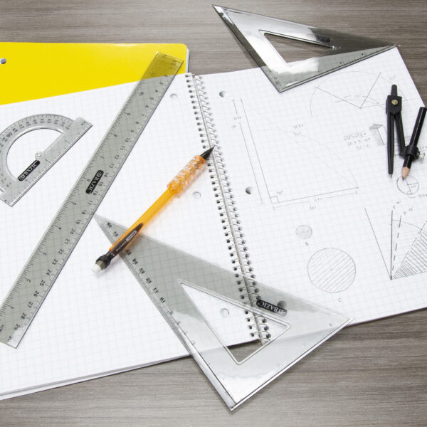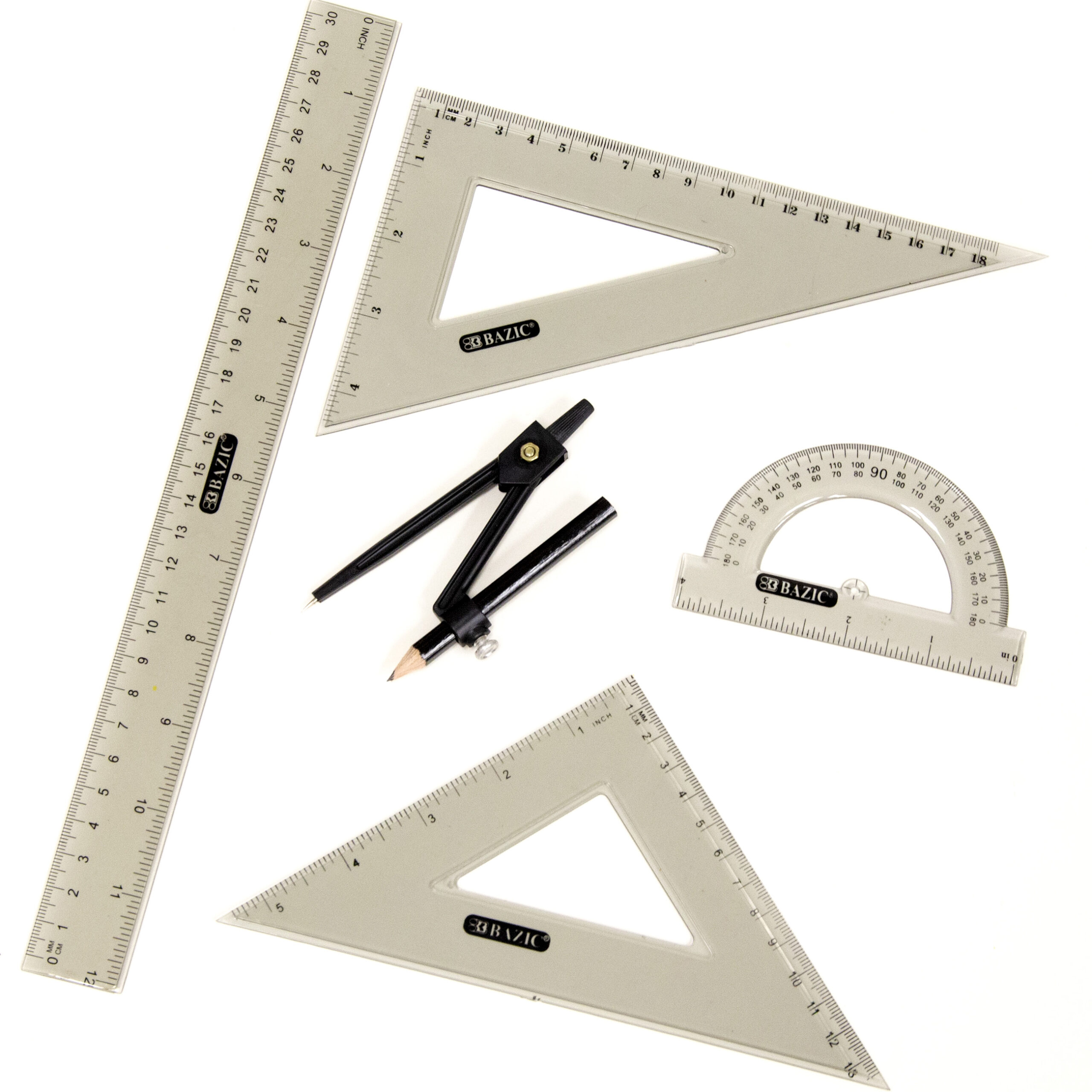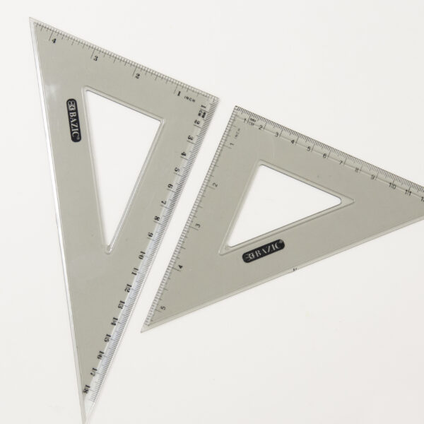 - MATH GEOMETRY KIT 4 PIECES. 12″ (30 cm) ruler + 5.25″ (13.3 cm) 30 /60 degree Triangle ruler + 4.25″ (10.8 cm) 45 /90 degree Triangle ruler + 4″ 180 Protractor + Pencil Compass