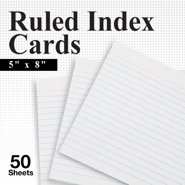 - PACKAGE INCLUDES. Ruled white index cards come with 50sheets in total per pack. These index cards have a ruled front and plain back.Size: 5″ x 8″inch