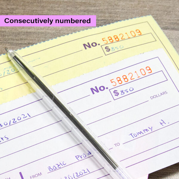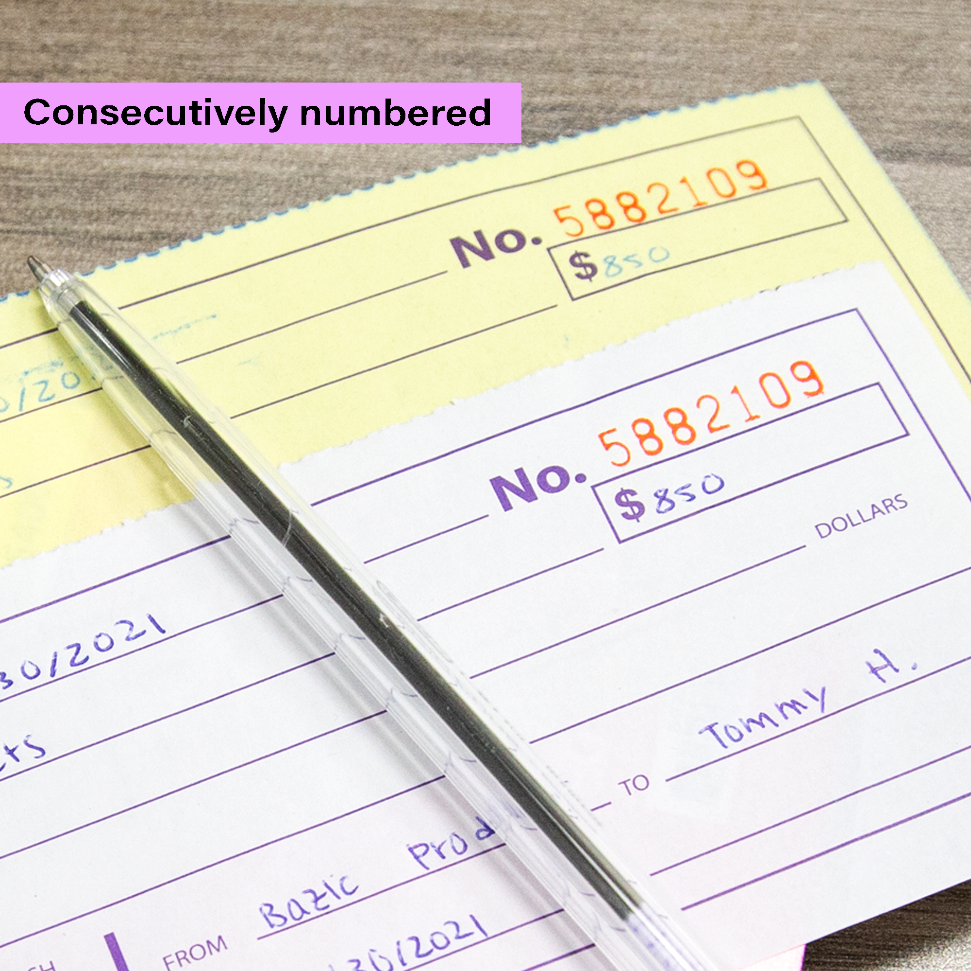 - CONSECUTIVELY NUMBERED. The unique large 6-digit receipt numbers printed in red helps you easily locate orders. Easily customize by using the extra space for your company stamp.