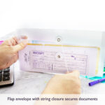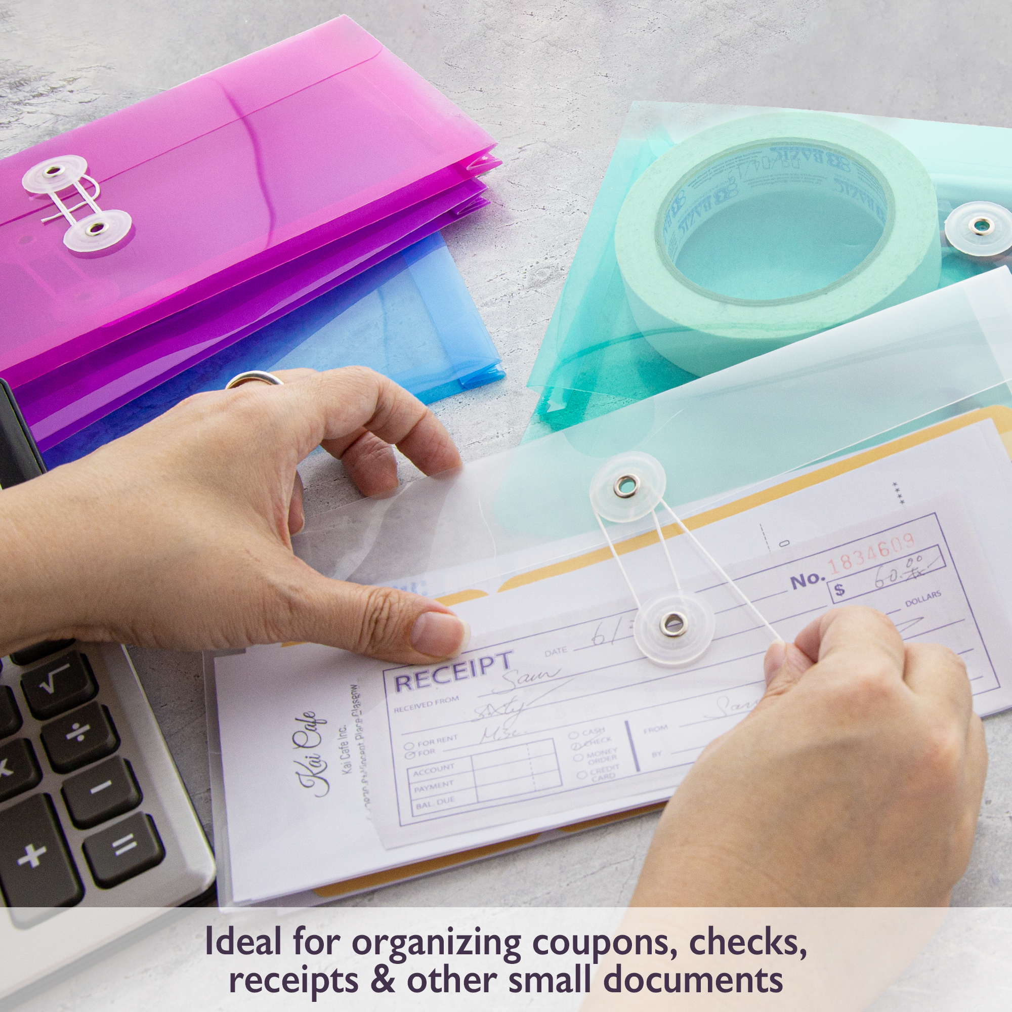 - ORGANIZER. 3-count per pack flap envelope with string closure. . Measure: 10.3″ x 5.25″. Expandable 1″ max. Made of durable polyester plastic. Safe & Non Toxic. Available in multiple colors.