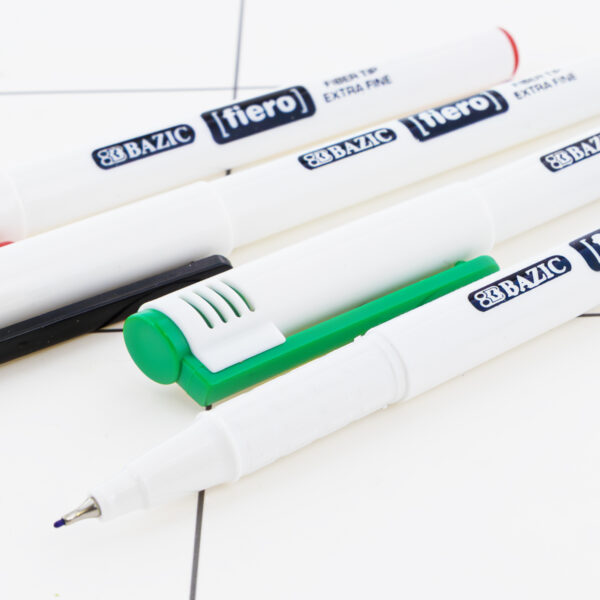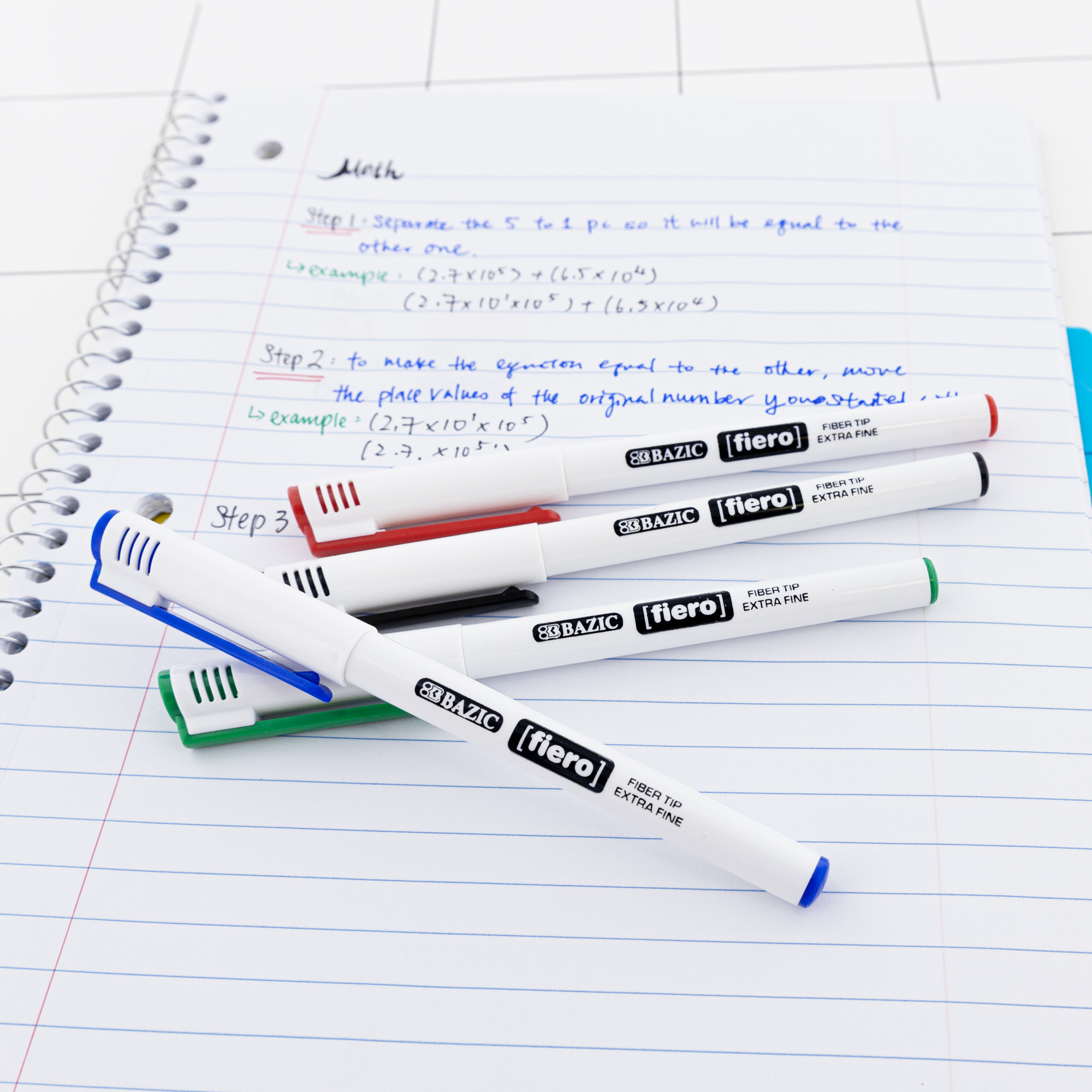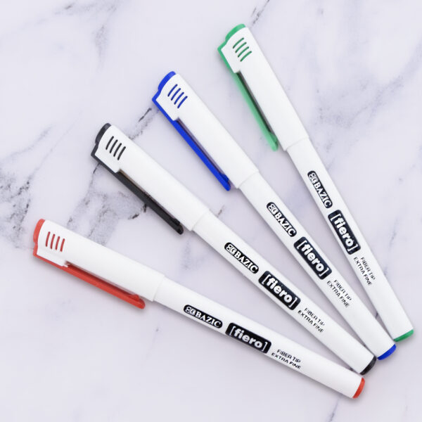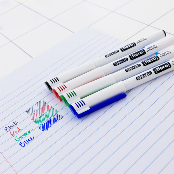 - FIERO ASSORTED COLOR FIBER TIP PEN. Each pack includes 4 pens. Fiber tip produces distinct fine lines for a more expressive writing that stands out on the page. Colors; Black, Blue, Red and Green.