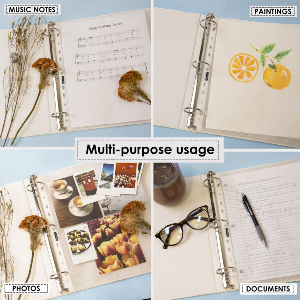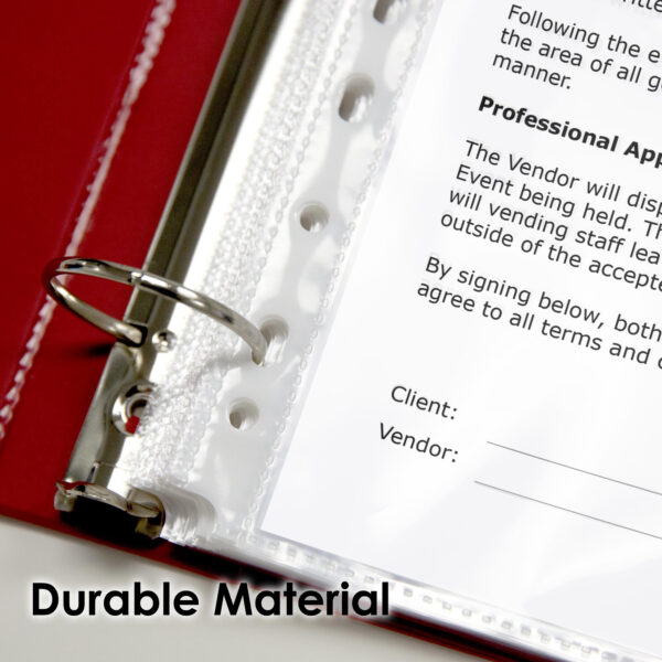 - MULTI USE. Consists of 11 pre-punched holes which fits into various types of ring binders. Non-stick and clear poly sheet protectors protects portfolio, projects, receipt, class work, or any business need.