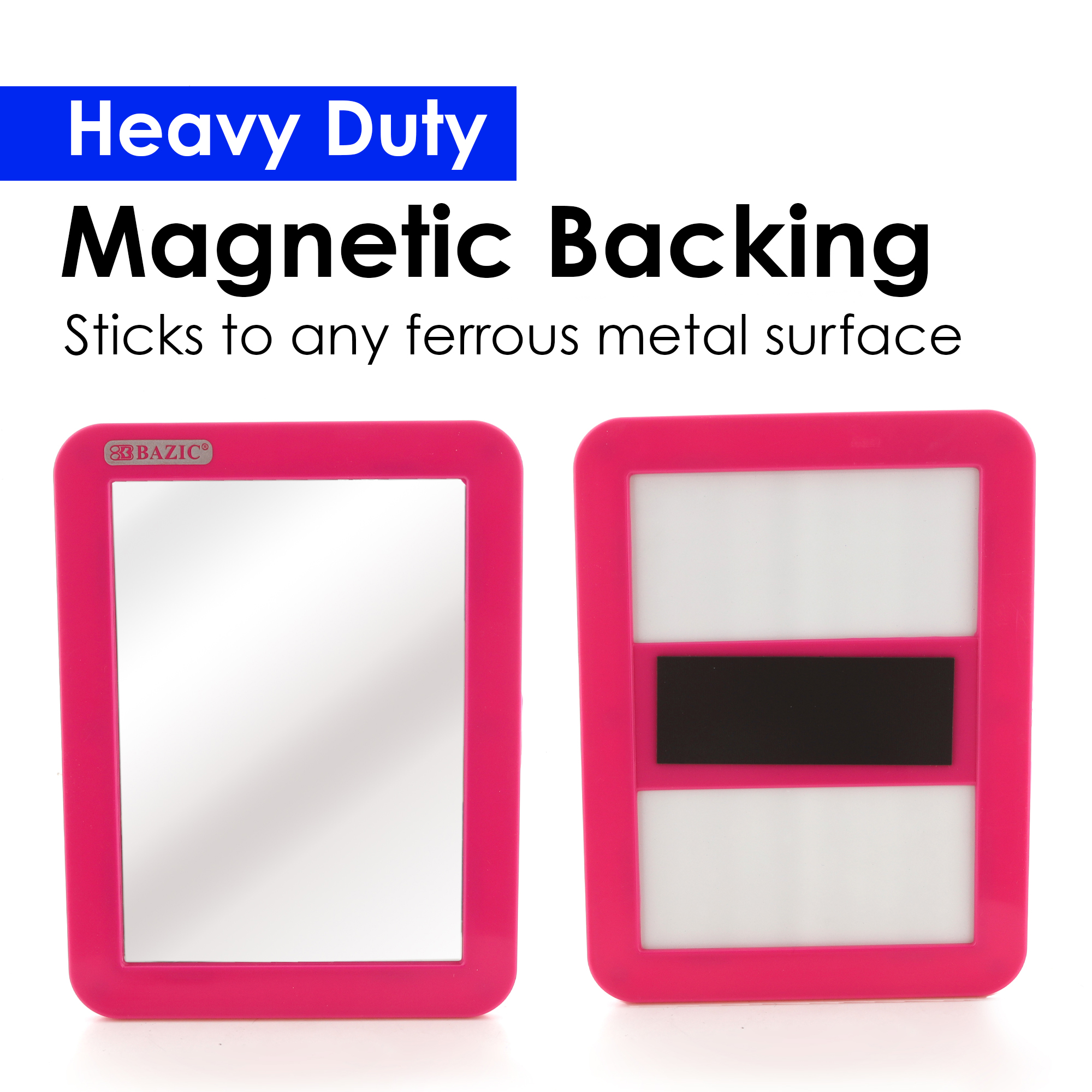 - MAGNETIC MIRROR. Sturdy magnets hold the mirror to the inside of a locker or onto other smooth metal surfaces such as a refrigerator. Mirror is framed in popular bright colors. Size: 5.5″ x 7″)