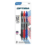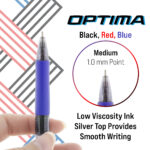 - OPTIMA ASSORTED RETRACTABLE OIL-GEL PENS. Each pack includes 3-Assorted Colors; Red, Blue and Black. Medium point spreads ink evenly as you write, offering dependable performance.