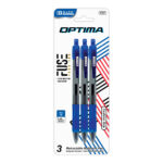 - OPTIMA BLUE RETRACTABLE OIL-GEL PENS. Each pack includes 3-Blue Retractable Pens. The medium point spreads ink evenly as you write, offering dependable performance for everyday use.