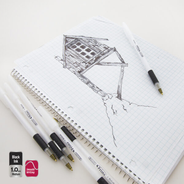 - PRIMA BLACK STICK PEN. Each pack includes 8-Prima Black Stick Pens. The medium ball point spreads ink evenly as you write, offering dependable performance. Cap each tip to prevent ink from drying or leaking.