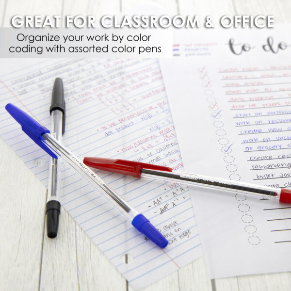 - PURE ASSORTED COLOR STICK PEN. Stick Pens come in an assortment of 12 colors; Red, Blue and Black. Medium ball point spreads ink evenly as you write, offering dependable performance for everyday use.