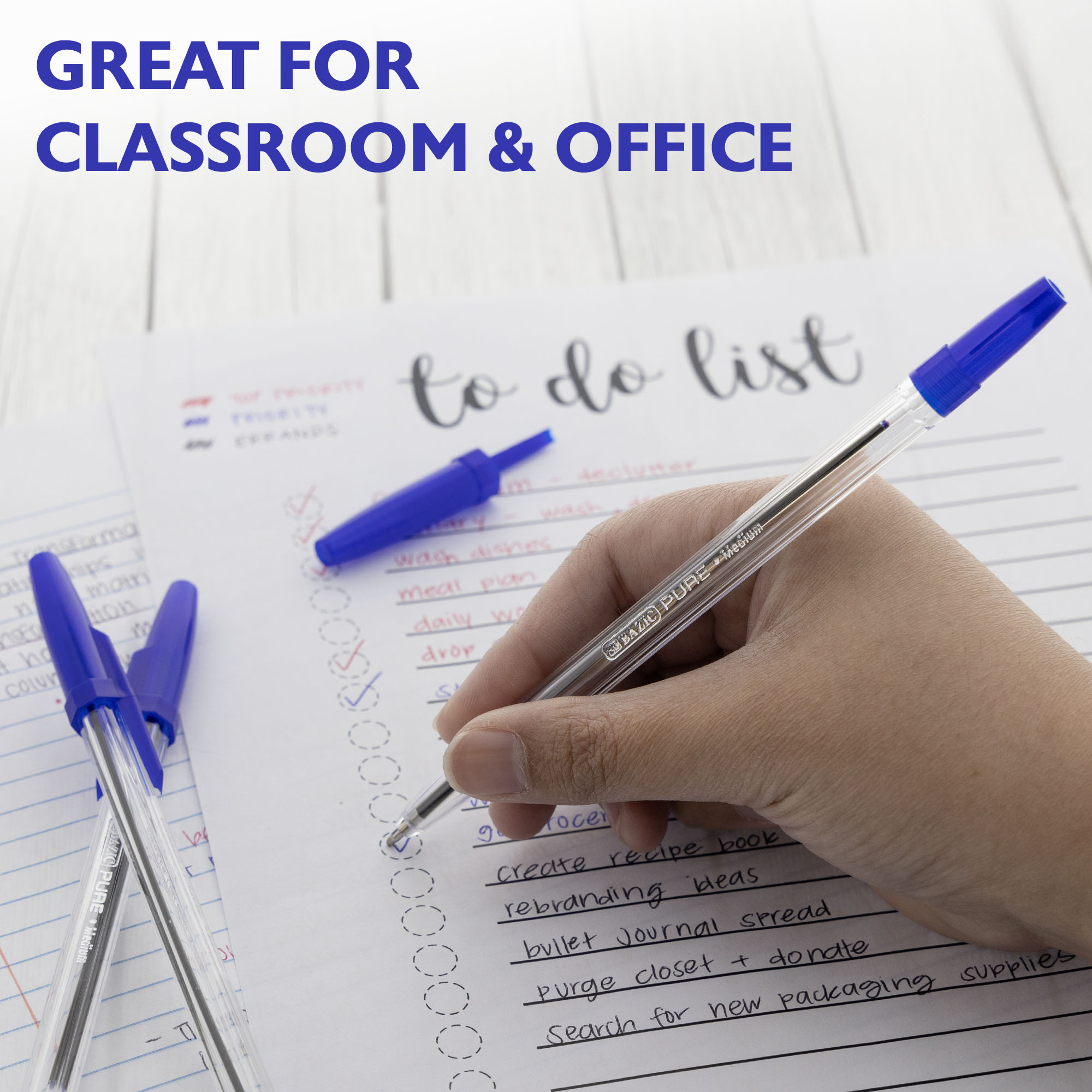 - PURE BLUE STICK PEN. Each pack comes with 12-Pure Blue Stick Pens. The medium ball point spreads ink evenly as you write, offering dependable performance for everyday use.