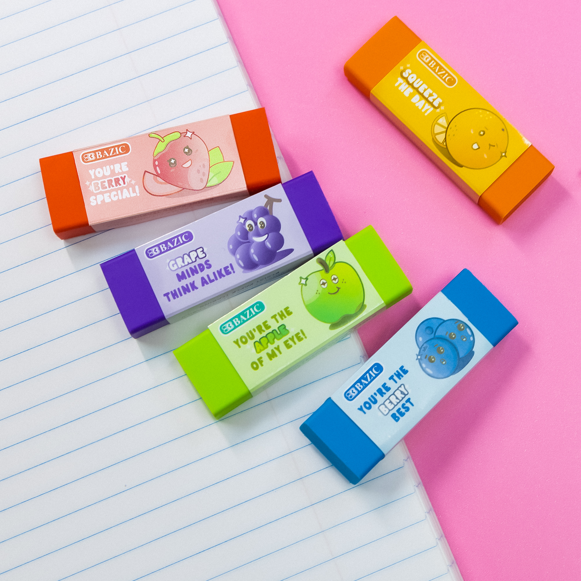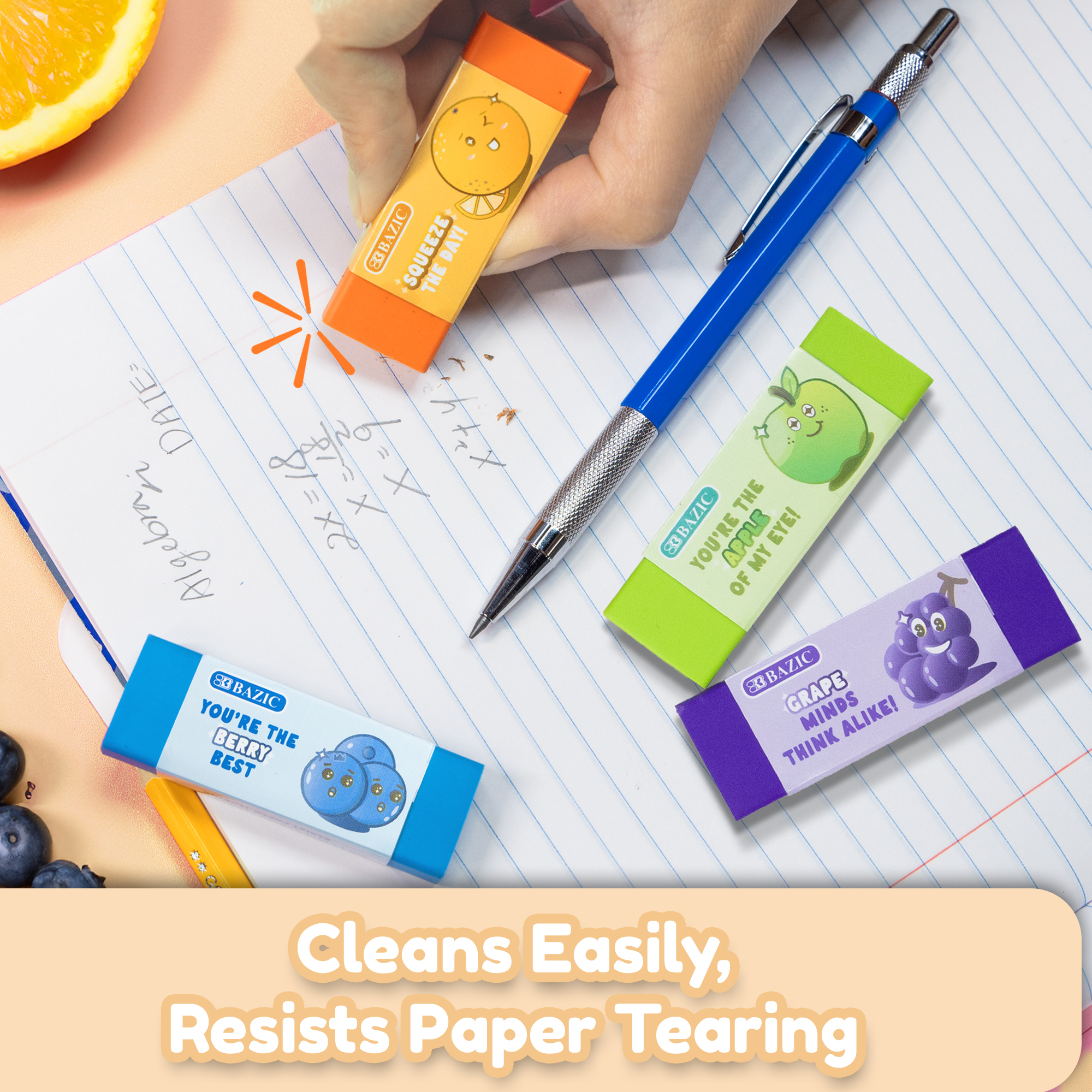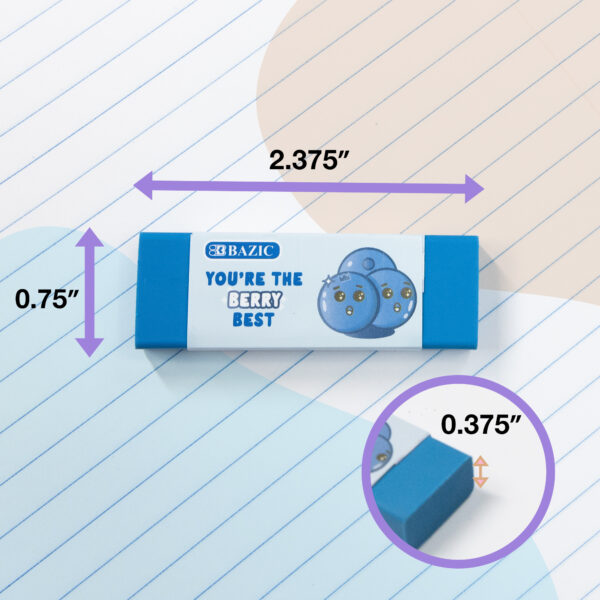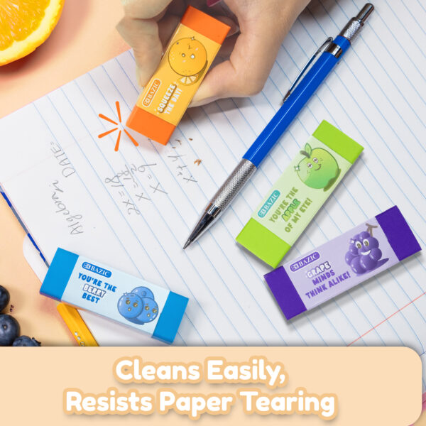 - VIBRANT SCENTS. Each eraser has a refreshing fruit scent, including strawberry, apple, orange, blueberry, and grape; Add a pleasant sensory experience to make erasing more enjoyable and refreshing