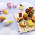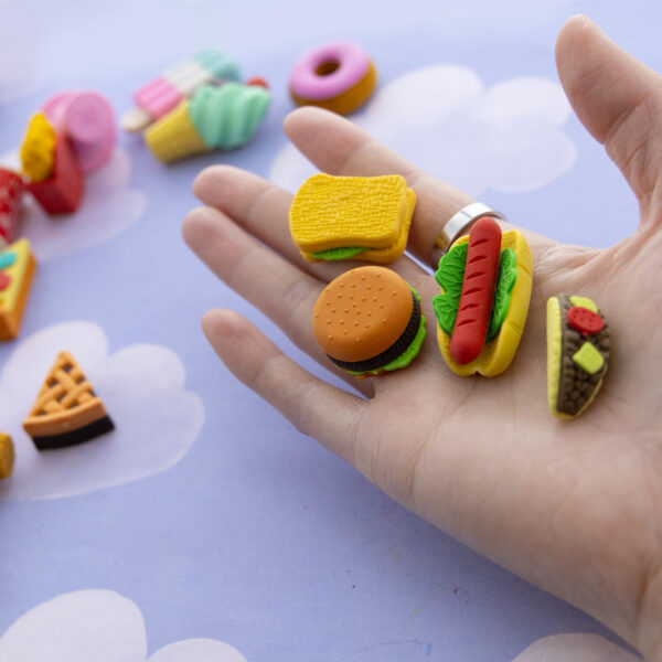 - FOOD THEME. Enjoy a variety of delectable 3D fun erasers shaped like popular food items such as hamburgers, pizza slices, ice cream cones, and more, for an appetizing twist to your essentials