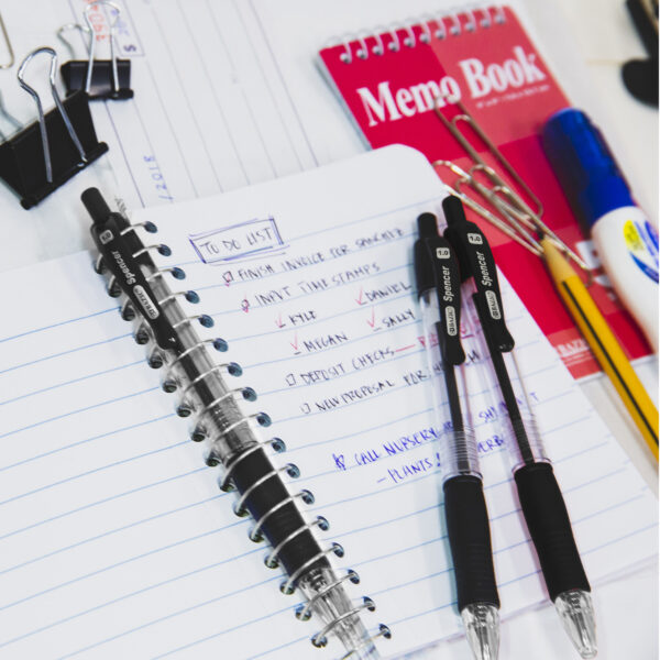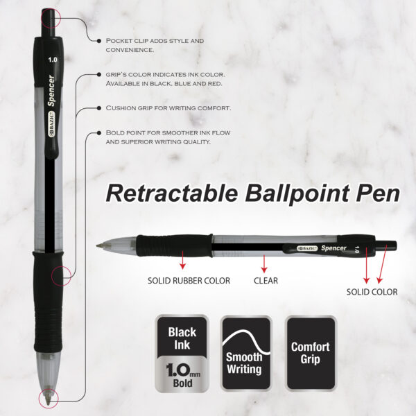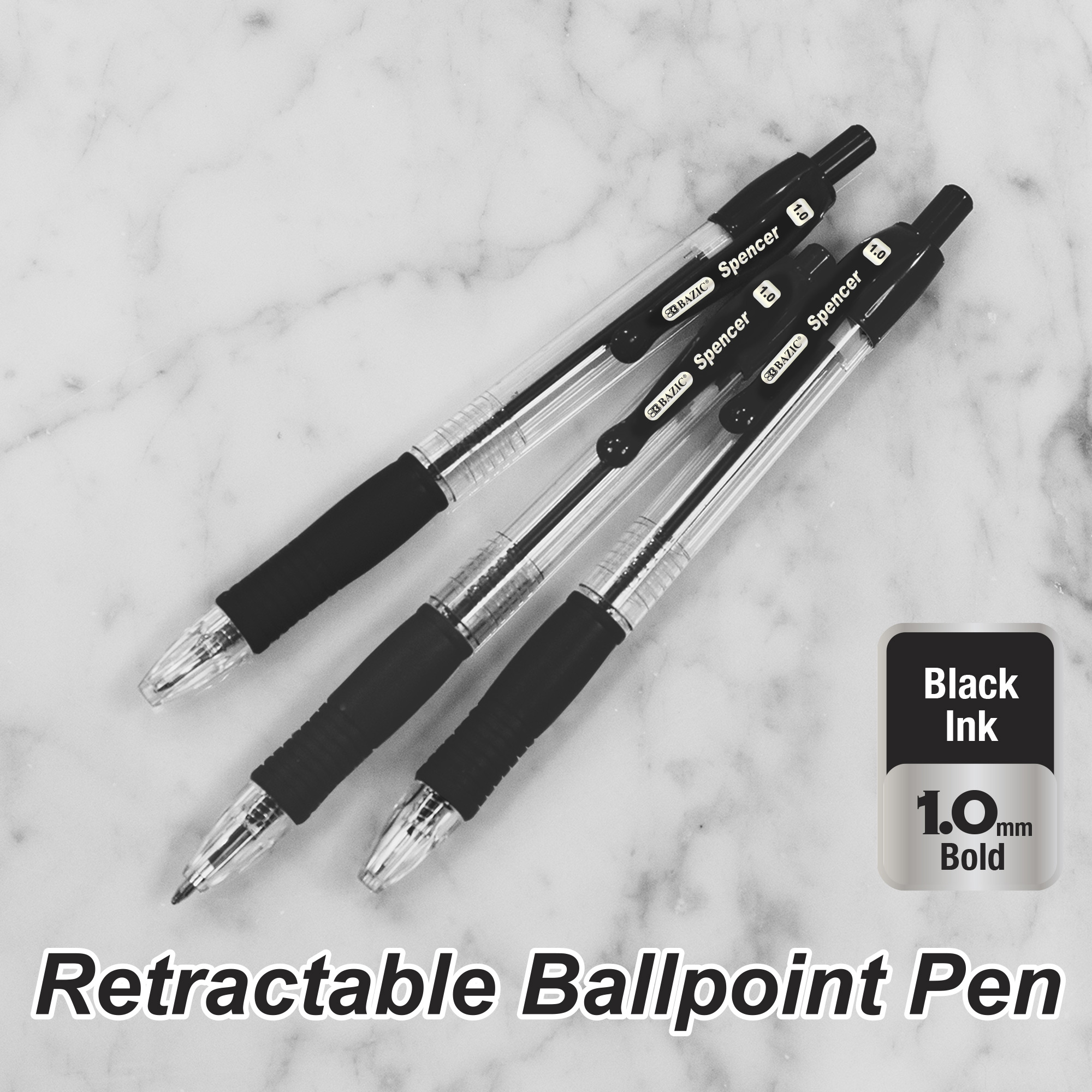 - SPENCER BLACK RETRACTABLE PEN. Each pack comes with 5-Black Retractable Pens. Medium ballpoint spreads ink evenly as you write, offering dependable performance for everyday use.