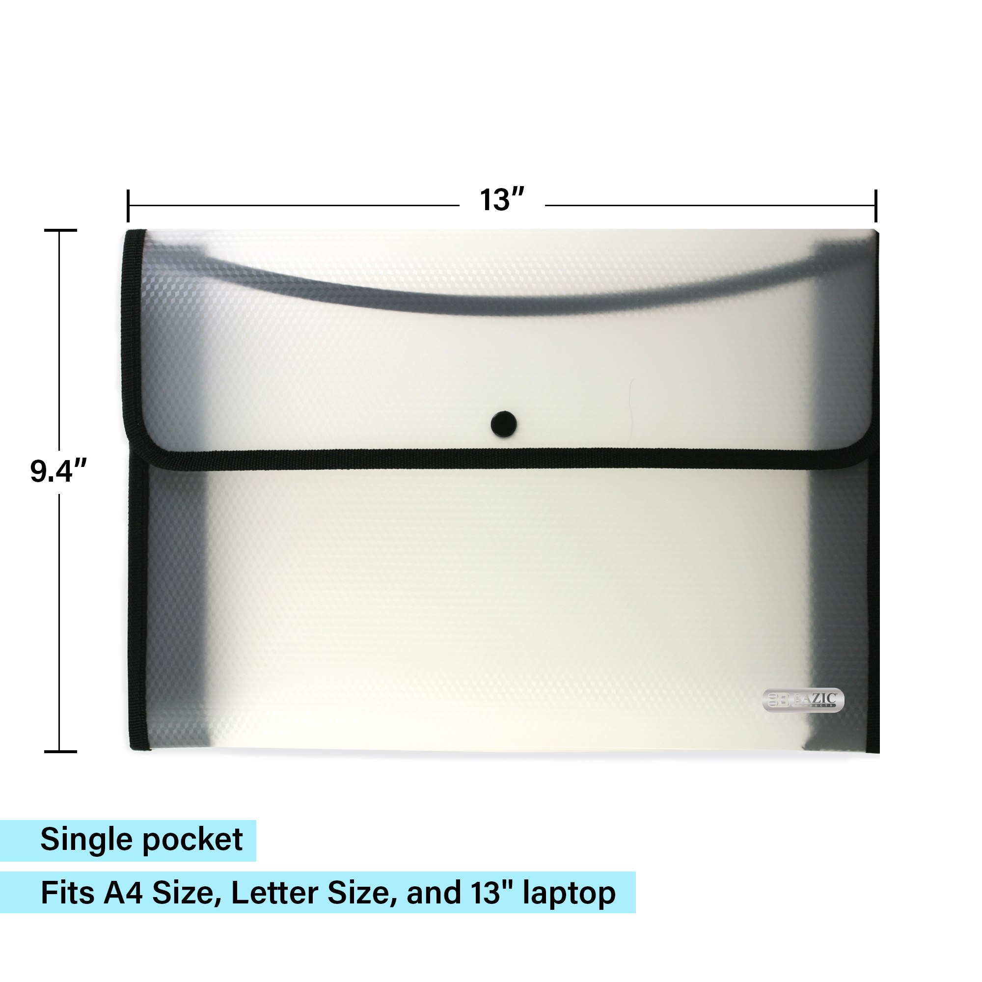 - FILE ORGANIZER. Made from high quality Polypropylene (PP) Plastic material. Safe & Non Toxic. Measure: 13″ x 9.4″. Expandable 2.5″ max. Single pocket. Fits A4Size, Letter Size, and 13″ laptop.